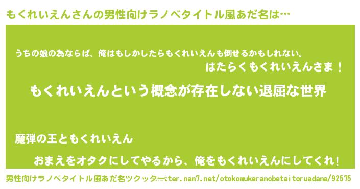 | 胡散臭い通販商品みたいなあだ名 | 『来世でも幸せになれる健康食品…その名も「もくれいえん」』 |