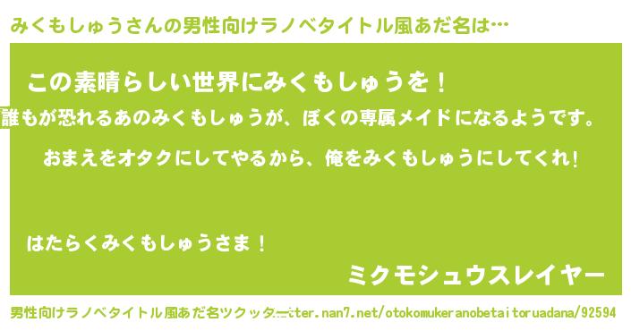 | ヘコむあだ名 | 『みくもしゅう(震え声)』『みくっふぃ~』 |