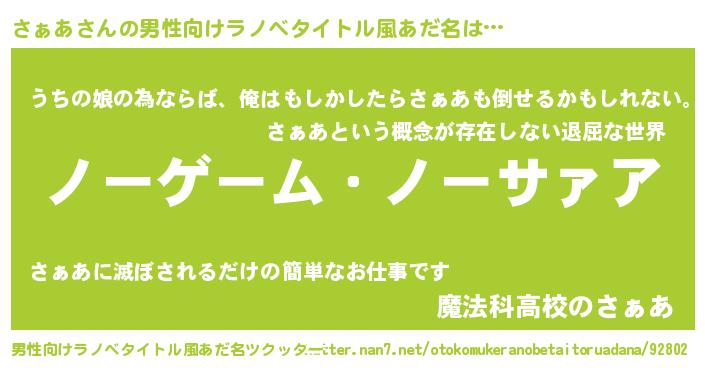 | 女子向けラノベタイトル風あだ名 | 『死神さぁあの再婚』『さぁあの婚約者』 |
