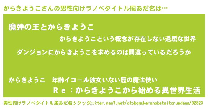 | 女子向けラノベタイトル風あだ名 | 『からきようこの卵を拾いまして』 |