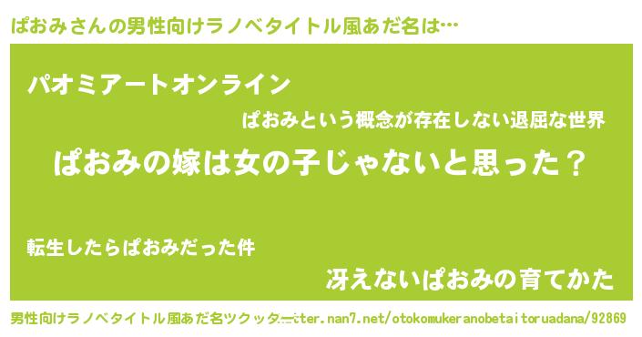 | 女子向けラノベタイトル風あだ名 | 『ぱおみ様がみてる』『ぱおみの契約王妃』 |