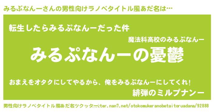 | 女子向けラノベタイトル風あだ名 | 『(仮)みるぷなんーのやんごとなき事情』 |