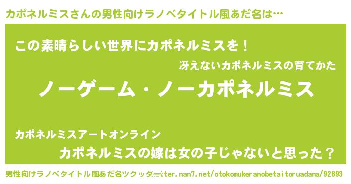 | 女子向けラノベタイトル風あだ名 | 『死神カポネルミスの再婚』 |