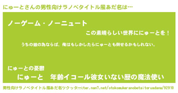 | 女子向けラノベタイトル風あだ名 | 『にゅーと伯爵の花嫁』 |