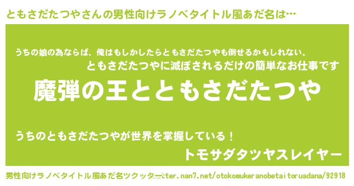 | 女子向けラノベタイトル風あだ名 | 『乙女ゲームの破滅フラグしかない悪役ともさだたつやに転生してしまった…』 |