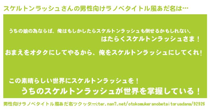 | 女子向けラノベタイトル風あだ名 | 『スケルトンラッシュ夫妻のなれそめ』 |