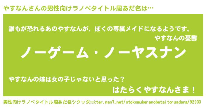 | 女子向けラノベタイトル風あだ名 | 『死神やすなんの再婚』 |