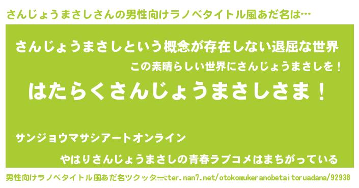| 胡散臭い通販商品みたいなあだ名 | 『絶対に幸福をもたらす健康食品…その名も「さんじょうまさし」』 |