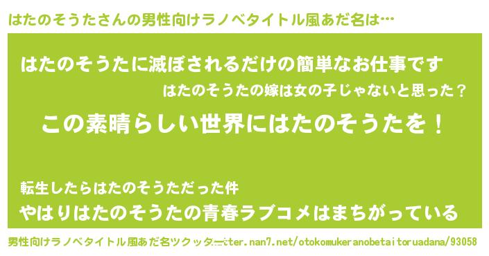 | 女子向けラノベタイトル風あだ名 | 『乙女ゲームの破滅フラグしかない悪役はたのそうたに転生してしまった…』 |