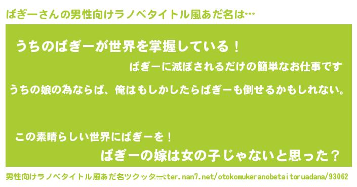 | 女子向けラノベタイトル風あだ名 | 『ばぎー伯爵の花嫁』『ばぎー様がみてる』 |