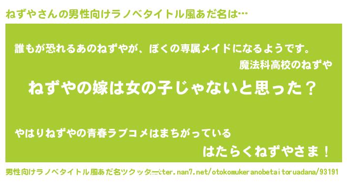 | 女子向けラノベタイトル風あだ名 | 『ねずや様がみてる』『ねずや伯爵の花嫁』 |