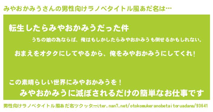 | 女子向けラノベタイトル風あだ名 | 『みやおかみう夫妻のなれそめ』 |