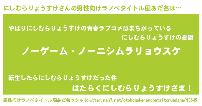 | 女子向けラノベタイトル風あだ名 | 『死神にしむらりょうすけの再婚』 |