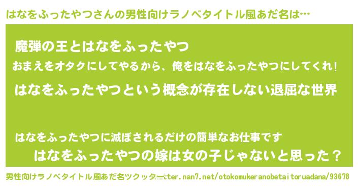 | 女子向けラノベタイトル風あだ名 | 『異世界で失敗しない100のはなをふったやつ』 |