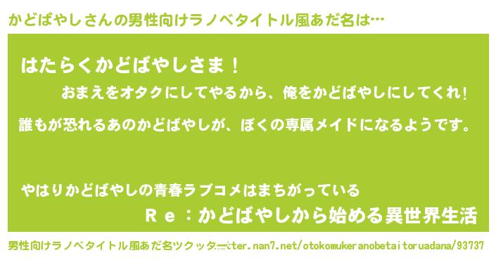 | 女子向けラノベタイトル風あだ名 | 『異世界でカフェかどばやしを開店しました。』 |