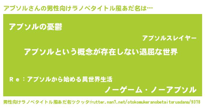 | 胡散臭い通販商品みたいなあだ名 | 『来世でも幸せになれる水素水…その名も「アブソル」』 |