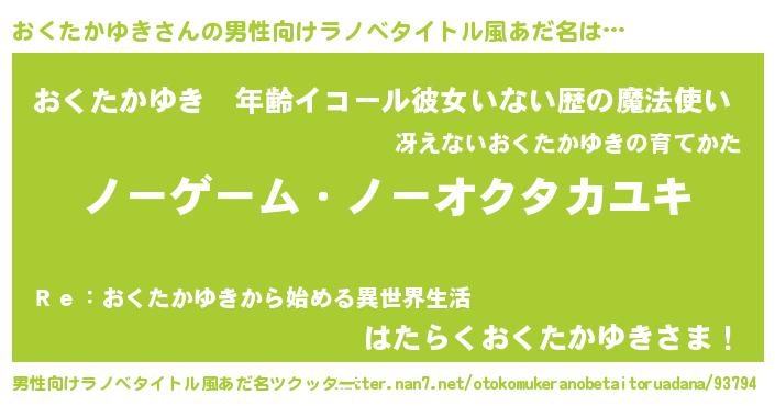 | 女子向けラノベタイトル風あだ名 | 『死神おくたかゆきの再婚』 |