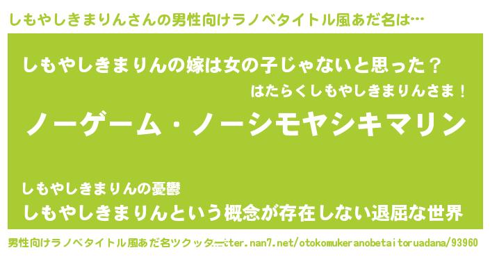 | 女子向けラノベタイトル風あだ名 | 『死神しもやしきまりんの再婚』 |