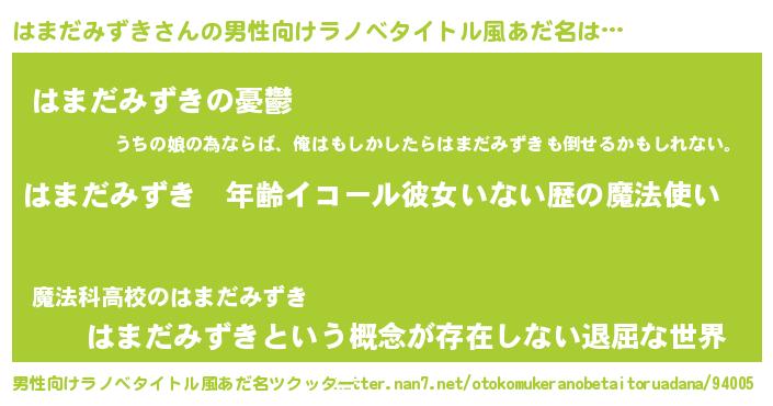| 女子向けラノベタイトル風あだ名 | 『はまだみずきの玉の輿計画!』 |