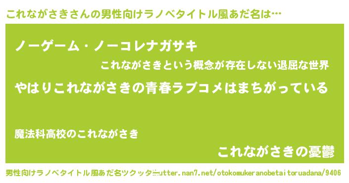 | 女子向けラノベタイトル風あだ名 | 『これながさき伯爵の花嫁』 |