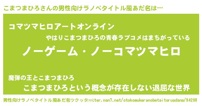 | 女子向けラノベタイトル風あだ名 | 『死神こまつまひろの再婚』 |