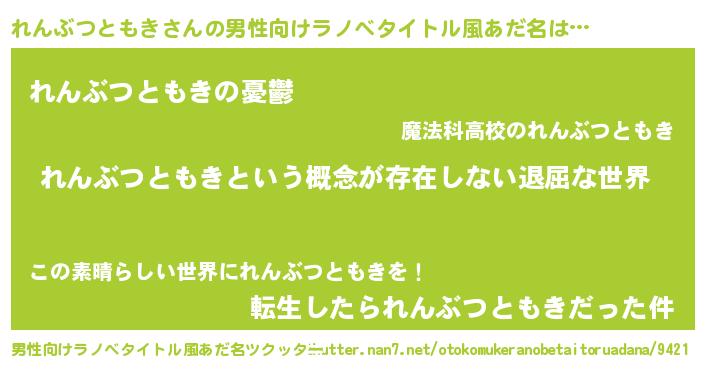 | 女子向けラノベタイトル風あだ名 | 『異世界で失敗しない100のれんぶつともき』 |