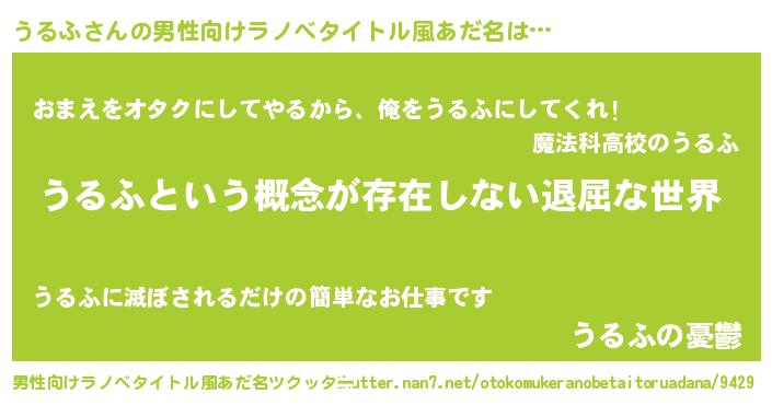 | 胡散臭い通販商品みたいなあだ名 | 『絶対に幸福をもたらす水素水…その名も「うるふ」』 |