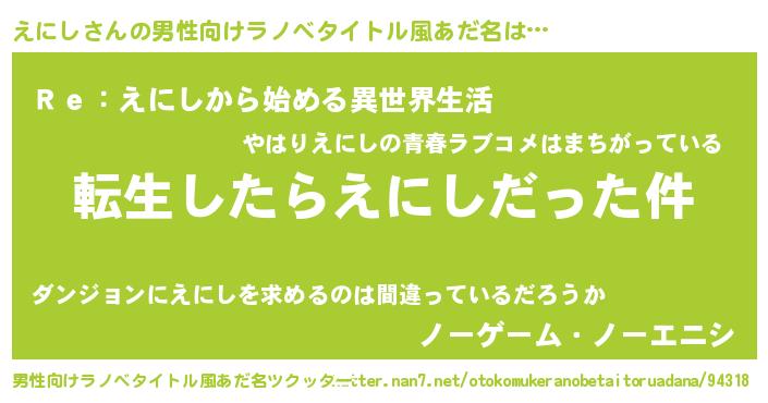 | 女子向けラノベタイトル風あだ名 | 『えにしの玉の輿計画!』『闇のえにし』 |