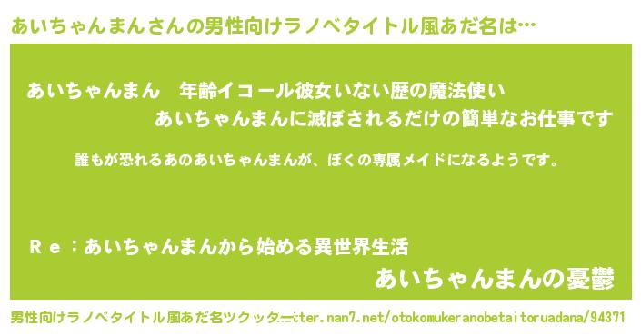 | 女子向けラノベタイトル風あだ名 | 『あいちゃんまんの契約王妃』 |