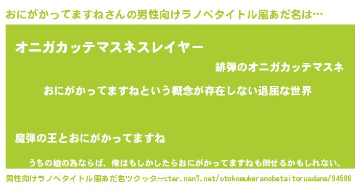 | 女子向けラノベタイトル風あだ名 | 『異世界で失敗しない100のおにがかってますね』 |