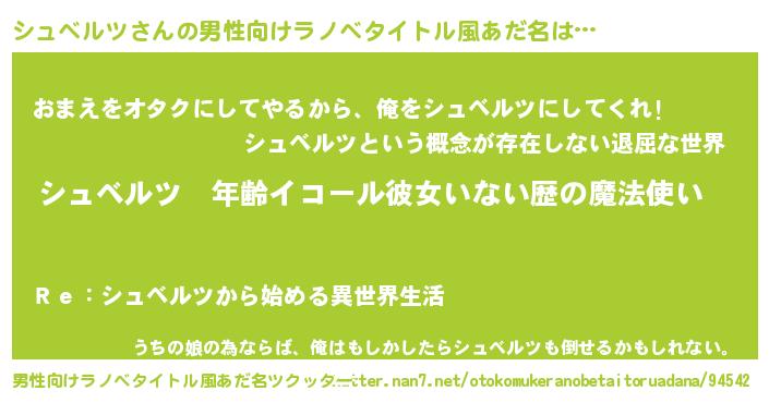 | 女子向けラノベタイトル風あだ名 | 『シュベルツの玉の輿計画!』 |