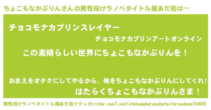 | 胡散臭い通販商品みたいなあだ名 | 『世界中を虜にした100年もののヴィンテージワイン…その名も「ちょこもなかぷりん」』 |