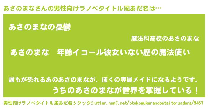 | 女子向けラノベタイトル風あだ名 | 『あさのまなの玉の輿計画!』 |