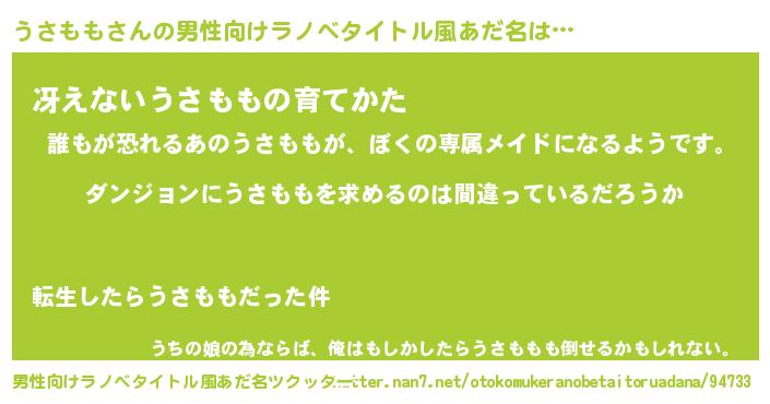 | 女子向けラノベタイトル風あだ名 | 『うさももの卵を拾いまして』 |