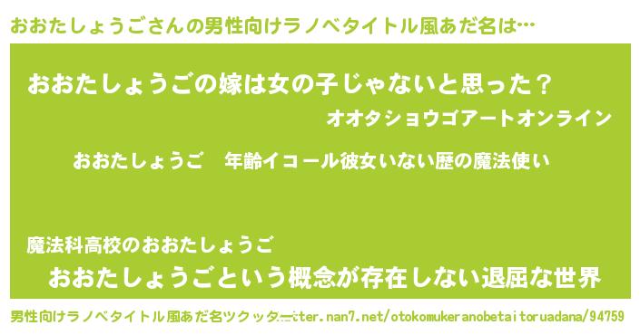 | 女子向けラノベタイトル風あだ名 | 『おおたしょうごの玉の輿計画!』 |