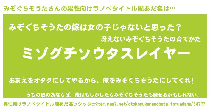 | 女子向けラノベタイトル風あだ名 | 『婚約破棄系悪役みぞぐちそうたに転生したので、保身に走りました。』 |
