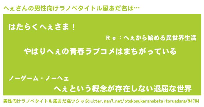 | 女子向けラノベタイトル風あだ名 | 『へぇの雑貨屋さん』『へぇの契約王妃』 |