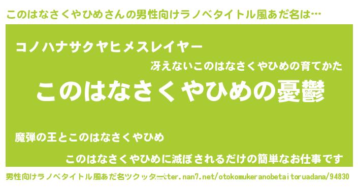 | 女子向けラノベタイトル風あだ名 | 『(仮)このはなさくやひめのやんごとなき事情』 |