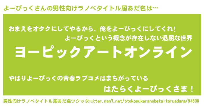 | 胡散臭い通販商品みたいなあだ名 | 『億万長者になれる霊験あらたかなお札…その名も「よーぴっく」』 |