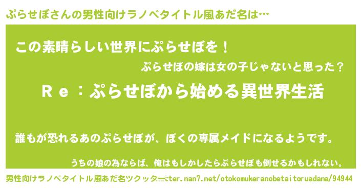 | 女子向けラノベタイトル風あだ名 | 『ぷらせぼストレイドッグス』 |