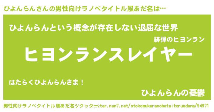 | 胡散臭い通販商品みたいなあだ名 | 『絶対に幸福をもたらす水素水…その名も「ひよんらん」』 |