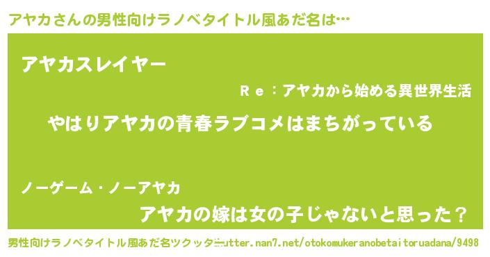 | 女子向けラノベタイトル風あだ名 | 『アヤカ伯爵の花嫁』『アヤカ様がみてる』 |