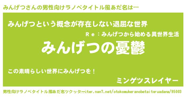 | 女子向けラノベタイトル風あだ名 | 『(仮)みんげつのやんごとなき事情』 |