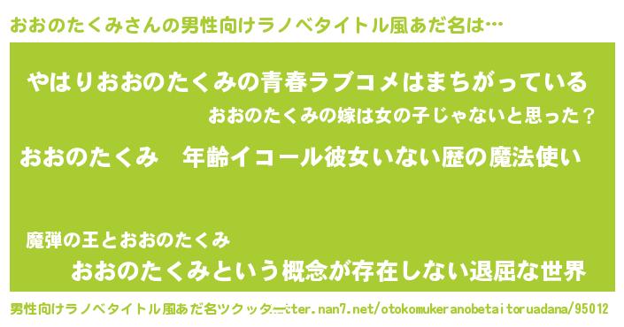 | 女子向けラノベタイトル風あだ名 | 『おおのたくみの玉の輿計画!』 |