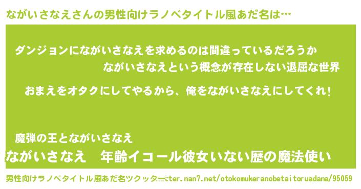| 女子向けラノベタイトル風あだ名 | 『ながいさなえ夫妻のなれそめ』 |
