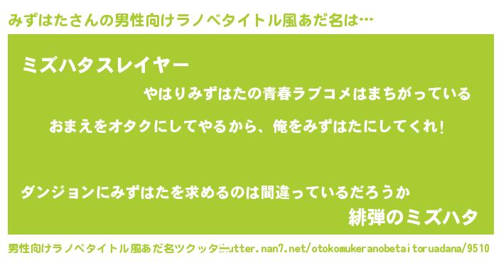 | 女子向けラノベタイトル風あだ名 | 『みずはた夫妻のなれそめ』 |