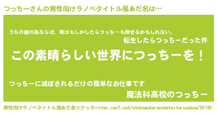 | 女子向けラノベタイトル風あだ名 | 『悪役つっちーに転生したようですが、知った事ではありません』 |