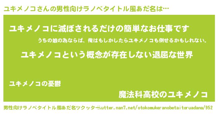 | 女子向けラノベタイトル風あだ名 | 『異世界で失敗しない100のユキメノコ』 |