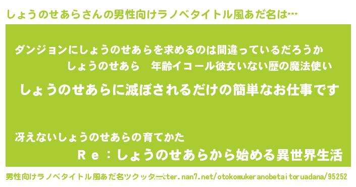 | 胡散臭い通販商品みたいなあだ名 | 『全米が絶賛したサプリメント…その名も「しょうのせあら」』 |