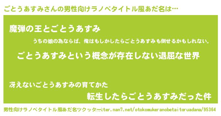 | 女子向けラノベタイトル風あだ名 | 『異世界で失敗しない100のごとうあすみ』 |